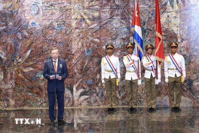 Theo đặc phái viên TTXVN, tối 26-9 theo giờ địa phương tại Cung Cách mạng ở thủ đô La Habana, sau khi kết thúc tốt đẹp cuộc hội đàm, Bí thư Thứ nhất, Chủ tịch nước Cuba Miguel Díaz Canel Bermudez đã chủ trì buổi lễ trao Huân chương Jose Marti cho Tổng Bí thư, Chủ tịch nước Tô Lâm.