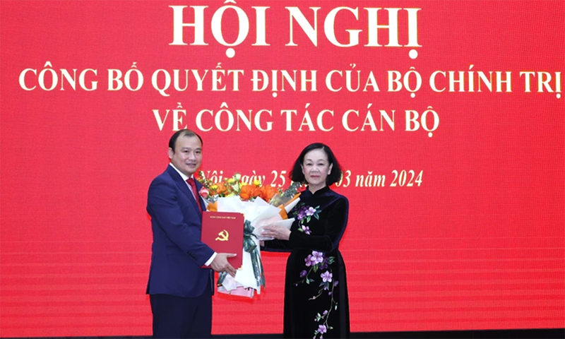Đồng chí Trương Thị Mai, Ủy viên Bộ Chính trị, Thường trực Ban Bí thư, Trưởng Ban Tổ chức Trung ương trao Quyết định của Bộ Chính trị cho đồng chí Lê Hải Bình.