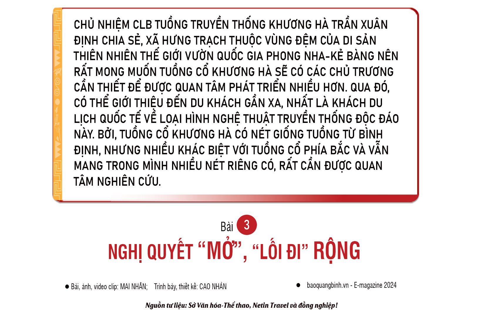 Chủ tịch UBND xã Hưng Trạch Lê Ngọc Sơn cho biết, xác định tầm quan trọng của các giá trị văn hóa trong đời sống, Nghị quyết Đại hội Đảng bộ xã Hưng Trạch lần thứ XXIV, nhiệm kỳ 2020-2025 đã đưa nội dung bảo tồn và phát huy các giá trị văn hóa truyền thống vào trọng tâm và nỗ lực thực hiện. Tuy nhiên, do địa phương còn gặp nhiều khó khăn nên các hoạt động hỗ trợ cho CLB Tuồng truyền thống Khương Hà nói riêng, các hoạt động liên quan đến văn hóa nói chung vẫn chưa được nhiều. Chủ yếu mới dừng lại ở mức động viên, khuyến khích, tạo điều kiện tối đa, còn về mặt vật chất vẫn hạn chế và chờ đợi các hoạt động xã hội hóa. Bên cạnh sự hỗ trợ từ huyện, CLB còn được tạo điều kiện tham gia các lớp tập huấn, bồi dưỡng của các sở, ngành và tổ chức, đoàn thể liên quan.