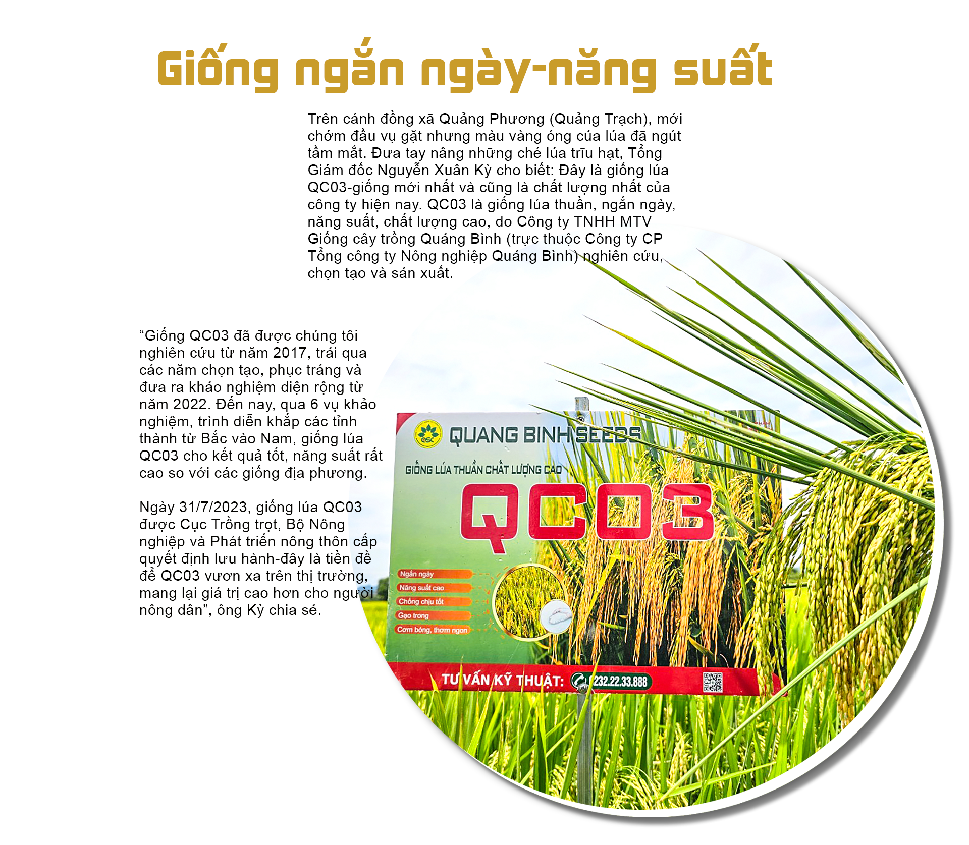 Vừa dẫn phóng viên đi thăm đồng, Tổng Giám đốc Nguyễn Xuân Kỳ vừa chia sẻ: Tại Quảng Bình, qua trình diễn ở nhiều huyện, giống lúa QC03 có những ưu điểm nổi trội, thích hợp gieo trồng cho cả 2 vụ sản xuất. Cụ thể, về tính chống chịu, trong vụ hè-thu, thời tiết tại Quảng Bình không được thuận lợi cho cây lúa sinh trưởng phát triển, giai đoạn lúa trổ có nắng nóng, gió tây nam cấp 6-7, một số trà giống trong vùng sản xuất bị ảnh hưởng đến quá trình thụ phấn dẫn đến lúa bị lem, tỷ lệ lép cao. Tuy nhiên, giống lúa QC03 có khả năng chống chịu điều kiện bất thuận rất tốt, chịu nóng tốt nên không ảnh hưởng nhiều đến quá trình thụ phấn, tỷ lệ hạt chắc cao, năng suất thực thu từ 65-70 tạ/ha.