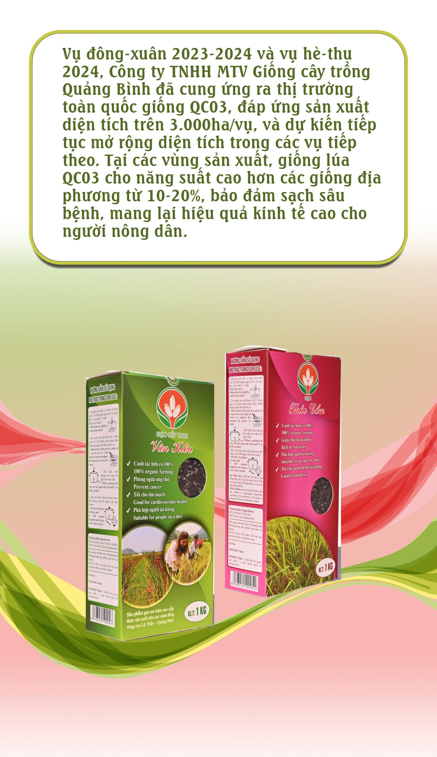 Trên đồng đất xã Duy Ninh (Quảng Ninh), giống lúa QC03 đã được Công ty TNHH MTV Giống cây trồng Quảng Bình phối hợp với địa phương triển khai các mô hình trình diễn và sau đó trồng thử nghiệm ở các vụ mùa cho kết quả rất tốt, bà con nông dân phấn khởi đón nhận.