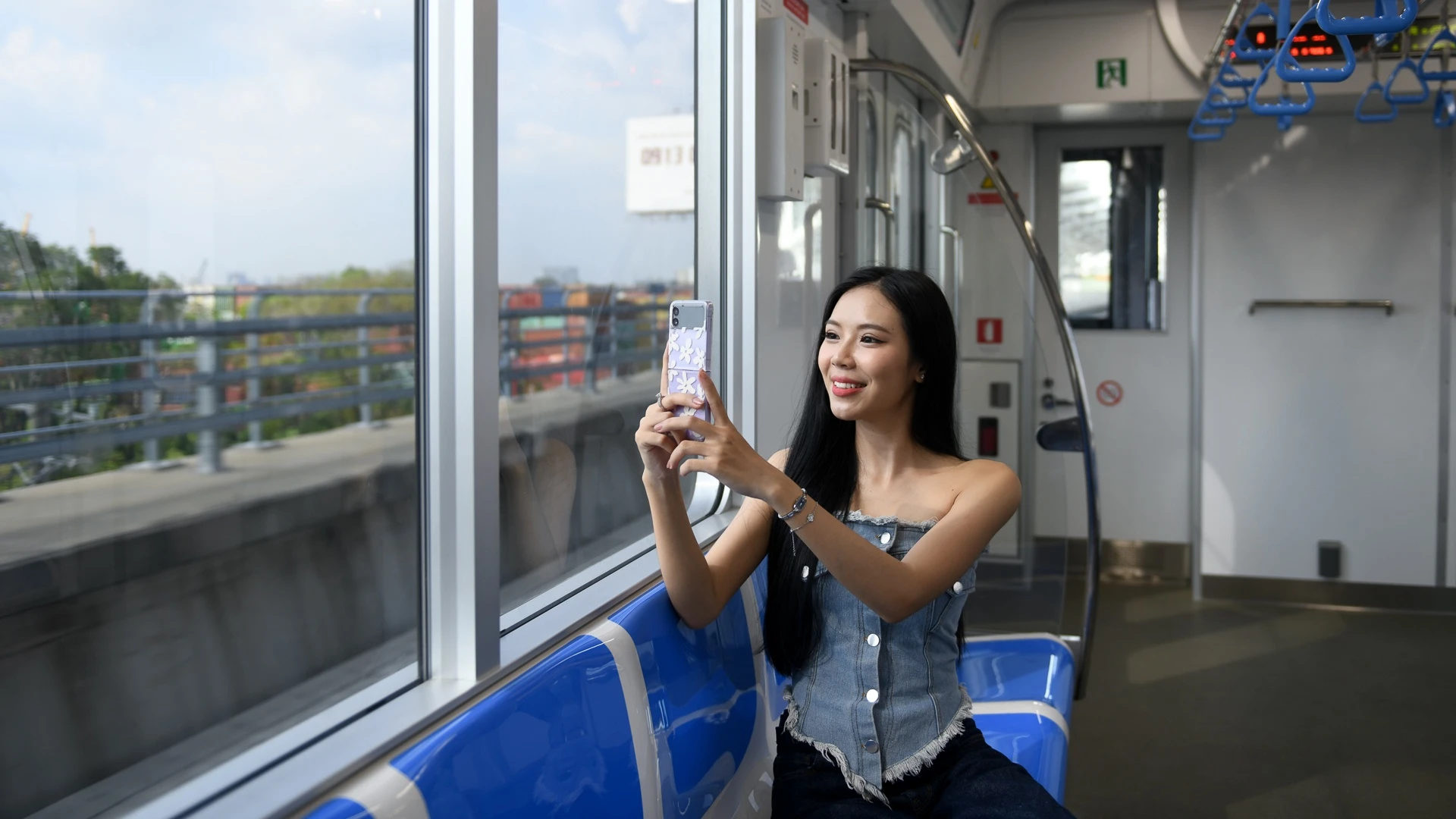 Tôi tiếp tục đi thêm 2 lượt tàu nữa vẫn không thấy chán. Không gian trên tàu từ cửa sổ, chỗ ngồi, chỗ đứng đều có tông màu xanh chủ đạo, cảm giác tinh tế và hiện đại.