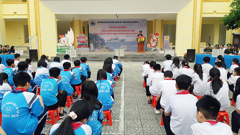 (QBĐT) – Sáng 17/4, tại Trường THCS Đồng Mỹ (TP. Đồng Hới), Đoàn Thanh niên Bộ đội Biên phòng (BĐBP) tỉnh phối hợp với nhà trường tổ chức buổi học ngoại khóa tuyên truyền về biên giới, hải đảo của Tổ quốc cho gần 600 học sinh đang theo học nơi đây.
