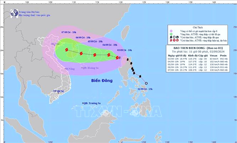 Dự báo, bão số 3 sẽ tiếp tục mạnh thêm, sức gió mạnh nhất trên biển có thể đạt cấp 13, giật cấp 16 trong những ngày tới, di chuyển nhanh về phía đảo Hải Nam (Trung Quốc) và khu vực Vịnh Bắc Bộ, khả năng rất cao ảnh hưởng trực tiếp đến vùng biển và đất liền khu vực Bắc Bộ và Bắc Trung Bộ nước ta.