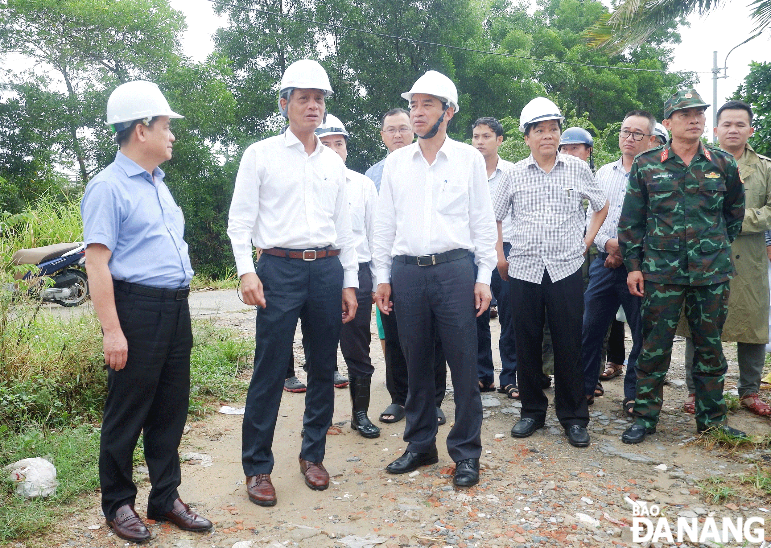 Chủ tịch UBND thành phố Lê Trung Chinh (thứ 3, bên trái sang) kiểm tra thực tế tại khu vực Khe Cạn, phường Thanh Khê Tây. Ảnh: MAI QUẾ