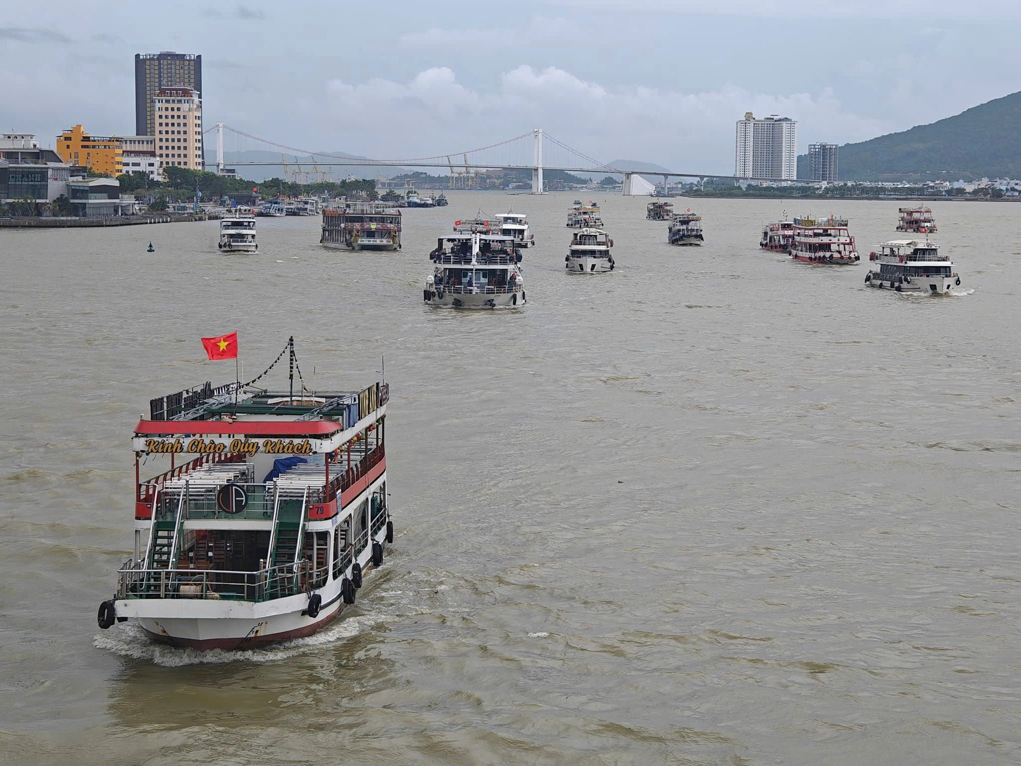 Các thuyền du lịch trên sông Hàn di chuyển về vị trí neo đậu an toàn để tránh trú mưa bão vào chiều 18-9. Ảnh: Đức Lâm